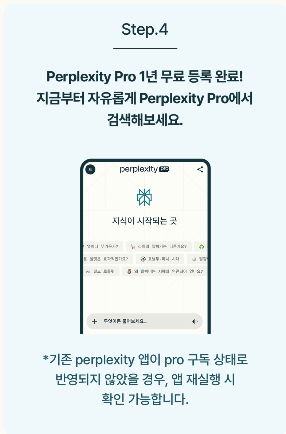 - 기존 Perplexity 사용자의 경우 무료 이용을 위해서는 회원 가입 이메일을 기존과 다른 것을 사용해야 무료 이벤트가 적용