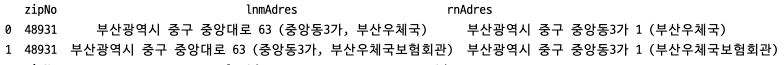 - 이번 예제에서는 우편번호만 추출하므로 맨 첫번째 우편번호만 추출 (df['zipNo'].iloc[0])하여 리턴함