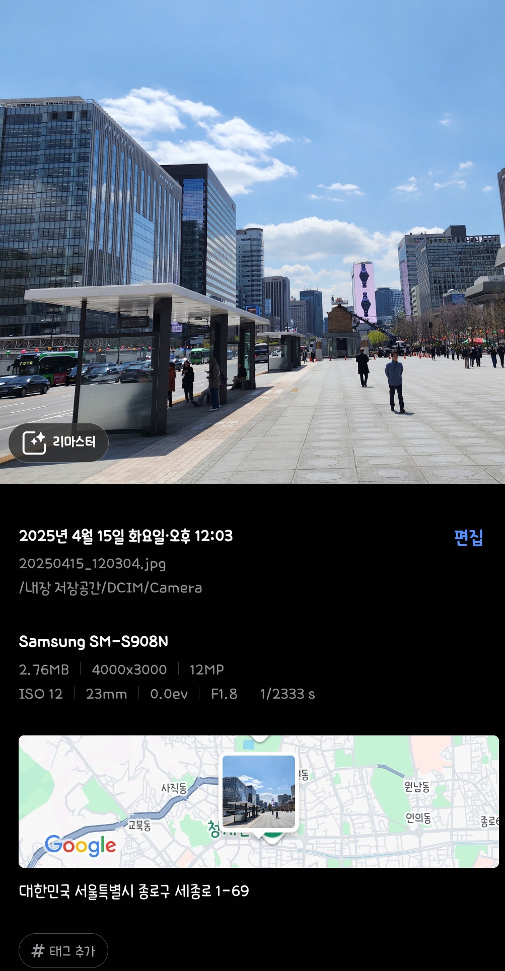 아래 이미지는 광화문에서 찍은 사진인데 촬영한 날짜, 시간, 핸드폰 기종, 해상도, 카메라 셋팅값, 파일용량, 저장위치, 파일명 등 다양한 정보를 확인 가능합니다. 여기에 위치정보도 같이 있어서 주소지 정보와 지도상 위치도 확인 가능합니다.