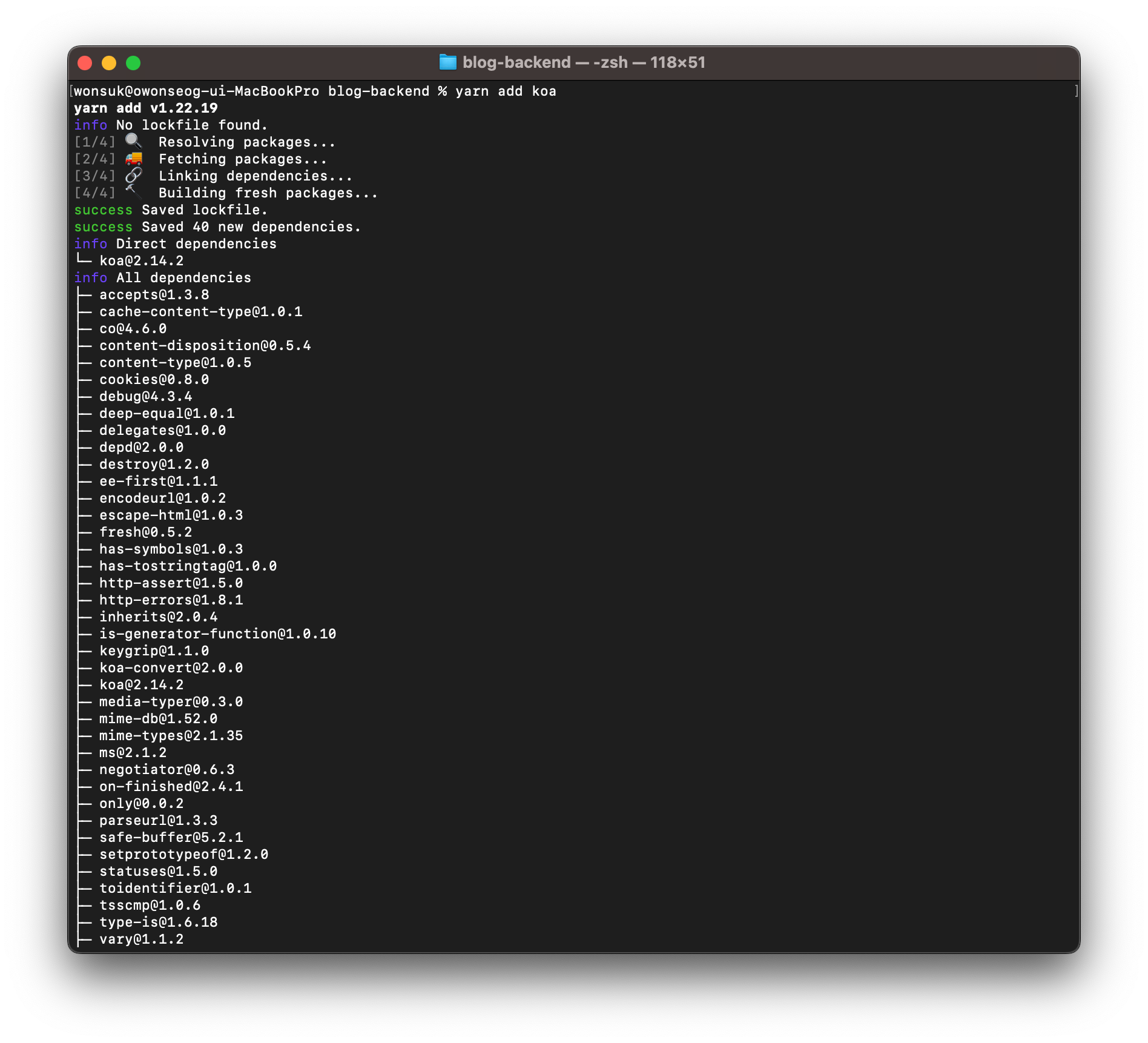 package.json 다시 조회시 dependencies에 koa 추가된 것 확인