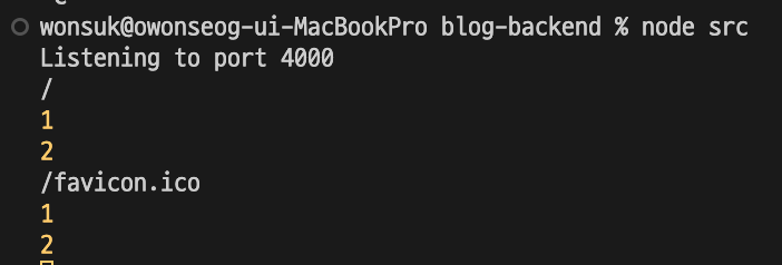 $ node src 로 다시 실행하고 localhost:4000 을 refresh 하면 console에 아래와 같이 보입니다.