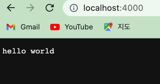 서버를 포트 4000번으로 열고, 서버에 접속하면 'hello world' 를 보여줍니다.