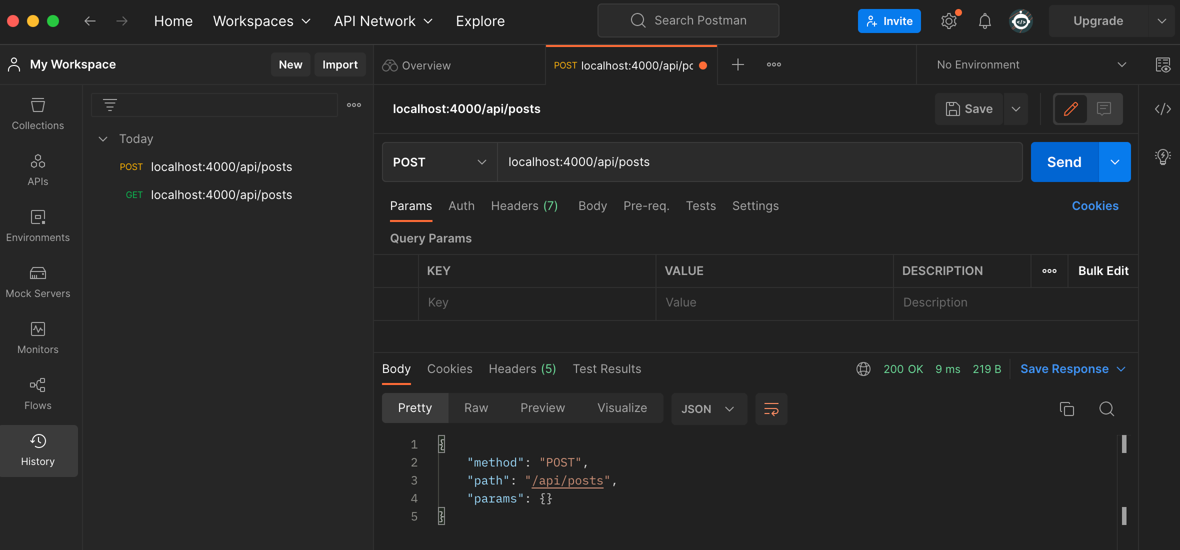 POST /api/posts 를 요청해 봅니다.