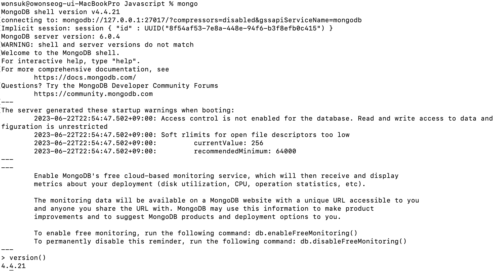 명령을 입력하면 터미널 기반 MongoDB 클라이언트가 실행되고 여기서 version() 이라는 명령을 입력하여 version 정보가 정상으로 보이는지 확인합니다.