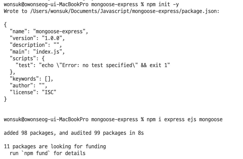 mongoose-express 디렉토리를 만들고 아래와 같이 초기 셋팅을 합니다.