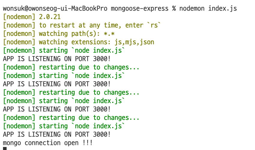 정상적으로 연결되면 mongo connection open 메시지가 표출됩니다.