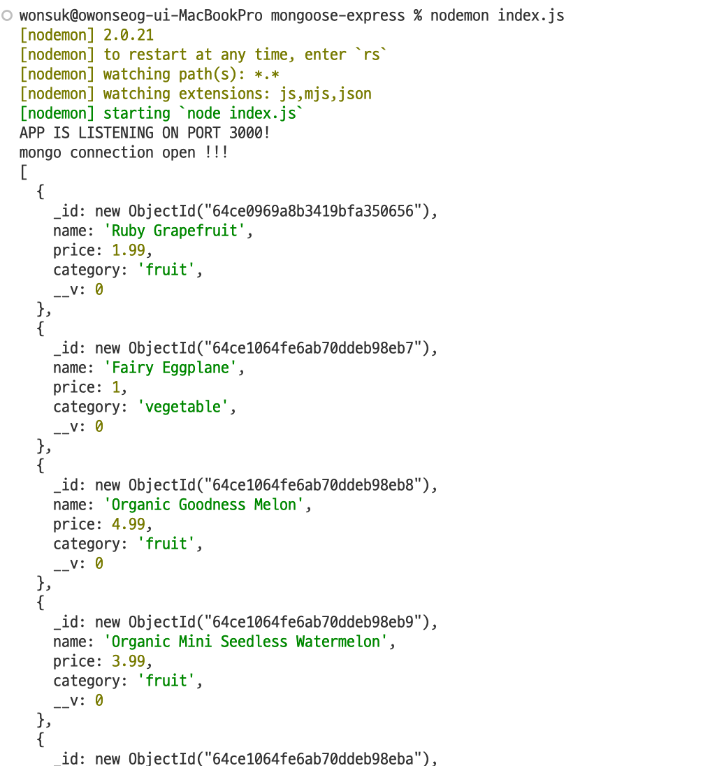 >nodemon index.js 로 서버를 실행하면 Prooducts 데이터를 불러옵니다.