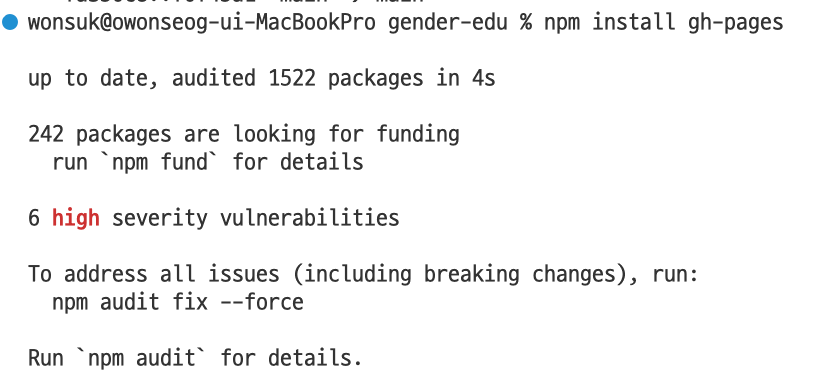 - VS Code 터미널에서 $ npm install gh-pages 로 gh-pages 를 설치합니다.