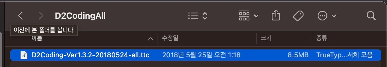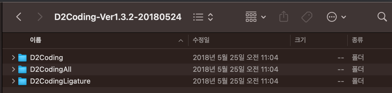 폰트를 다운로드 받아 압축을 풀고 D2CodingAll 폴더의 파일을 더블클릭하면 글꼴이 설치 됩니다.