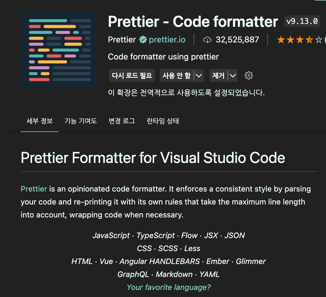 JavaScript, TypeScript, Flow, JSX, JSON, CSS, SCSS, HTML, Vue, Angular, GraphGL, Markdown, YAML 지원