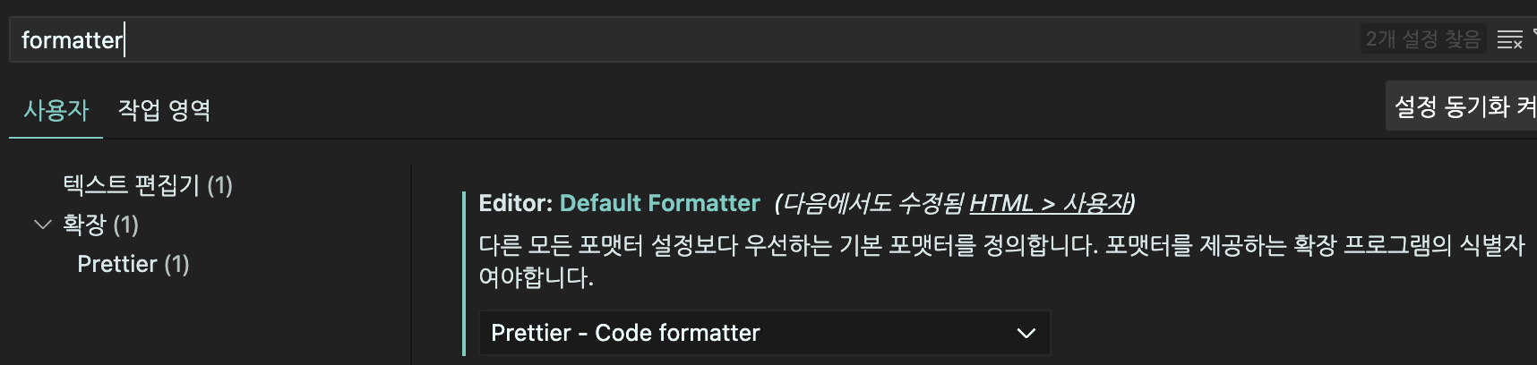 설치후 VSCode 설정 메뉴에서 formatter 검색하고 "Default Formatter"를 Prettier 로 변경합니다.