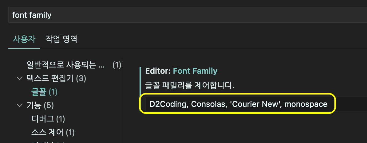 VSCode 실행하고 "command + ," 으로 옵션 화면 들어가서 상단에 font family 로 검색합니다.