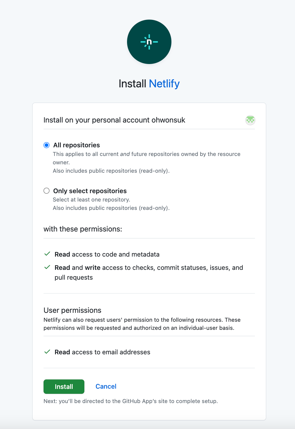 Github 에 있는 repository중에서 전체 또는 하나만 선택할 것인지 묻는데 전체를 선택하고 해당된 repository를 불러옵니다.