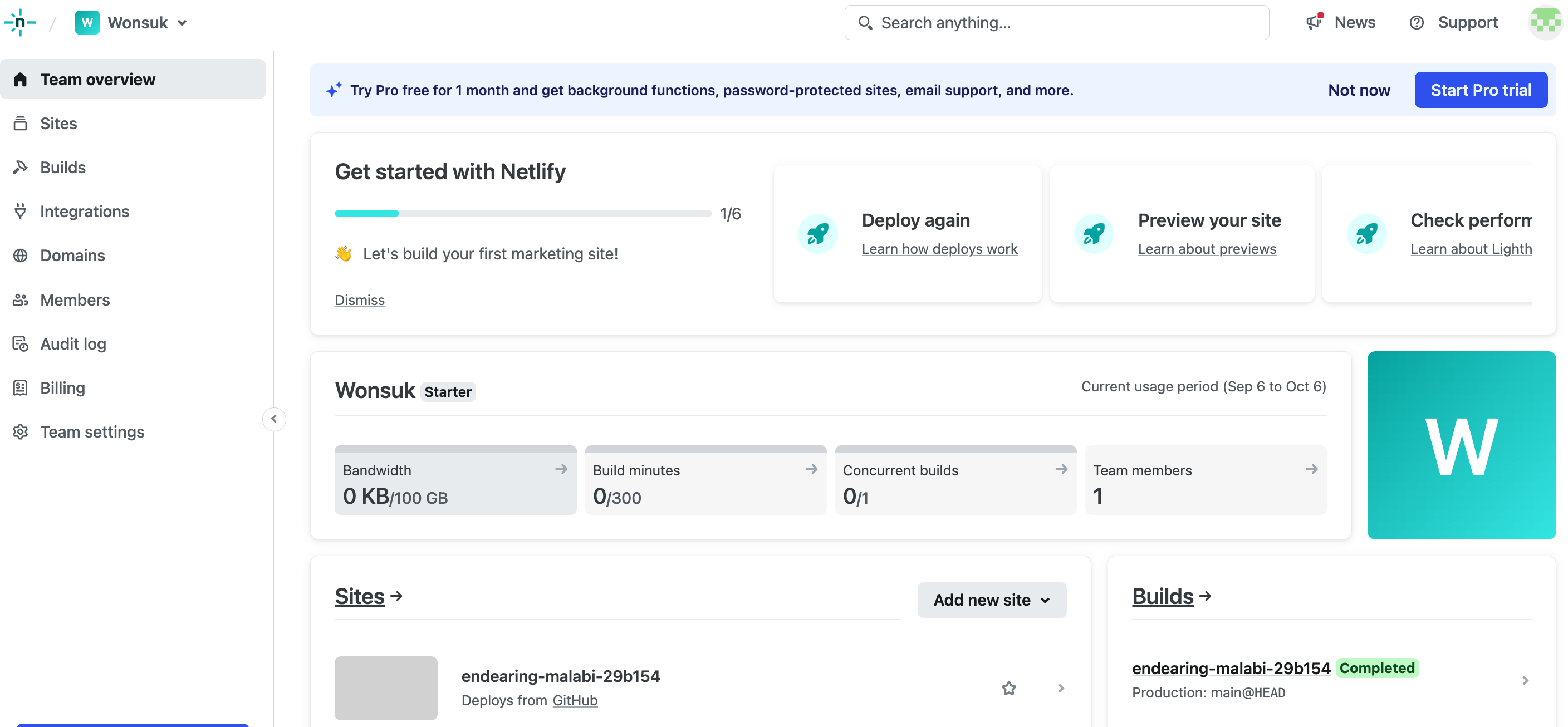 - netlify - 1개 site 무료, 용량제한 존재 (bandwidth 월100G, build 시간 월300분