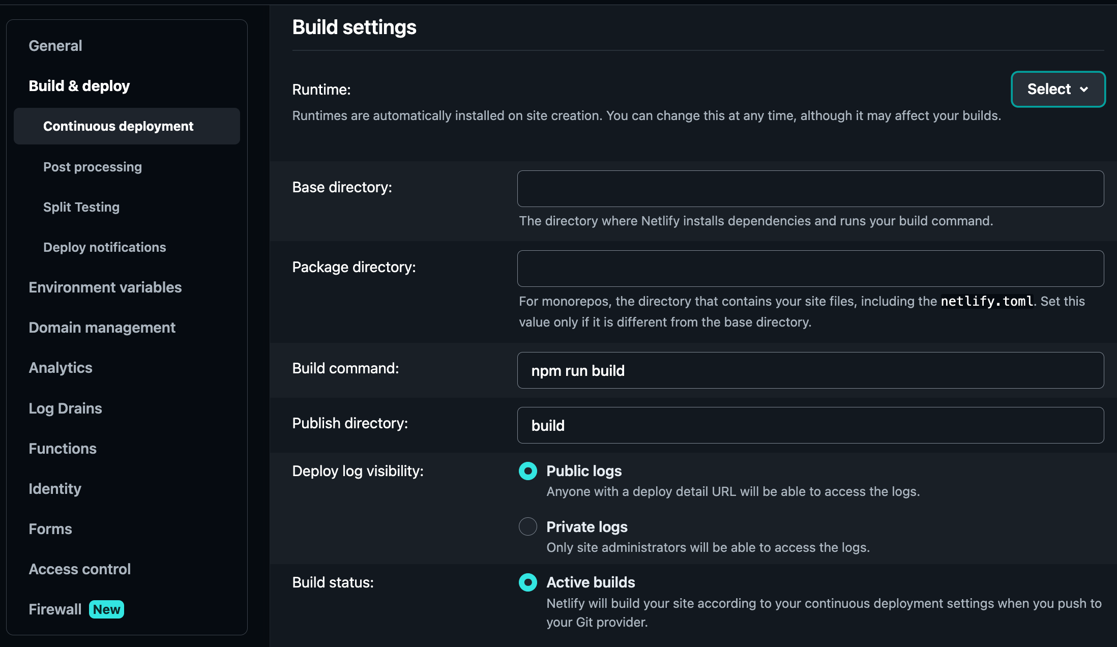 Build settings 에서 Build command 와 Publish directory를 설정합니다.