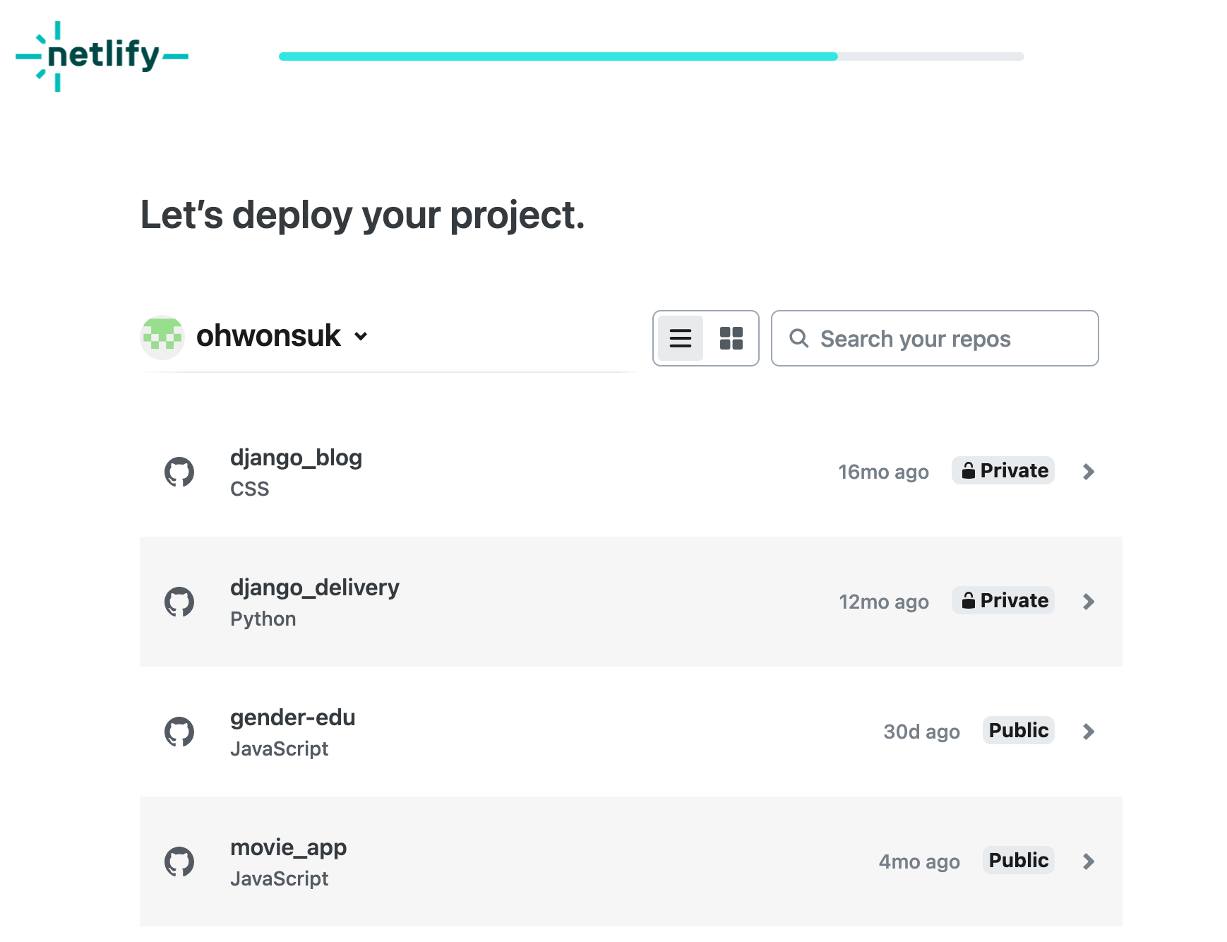 계정이 있는 github로 가입하게 되면 아래와 같이 배포할 프로젝트가 존재하는 사이트중에서 Deploy with Github 를 선택합니다.