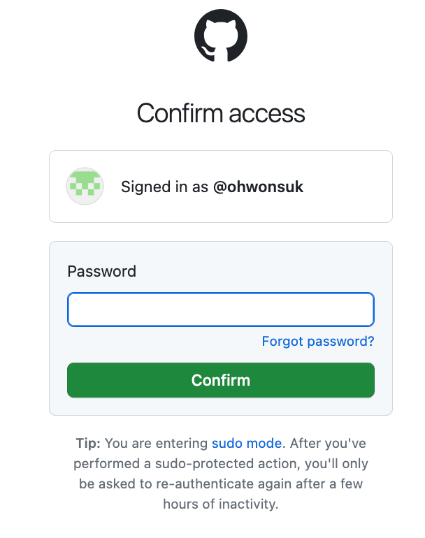 Github repository 접근확인 하기 위해 해당 계정의 패스워드를 입력합니다.
