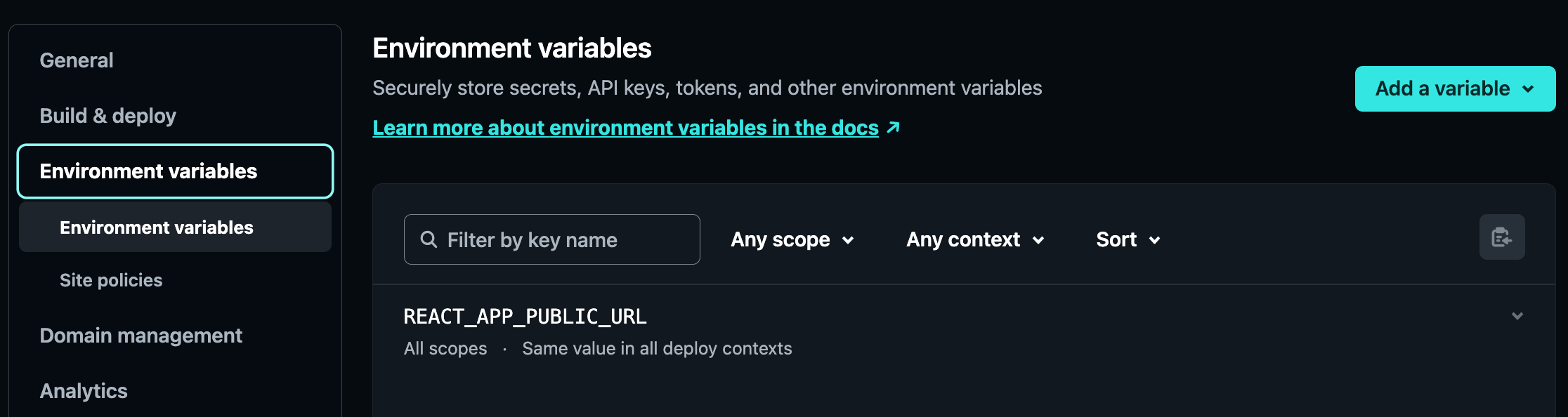 .env 관련 설정(URL, 외부 API Key 값 등)은 Environment variables 메뉴에서 Add a variable로 등록해야 배포 후 사이트가 정상 동작됩니다.