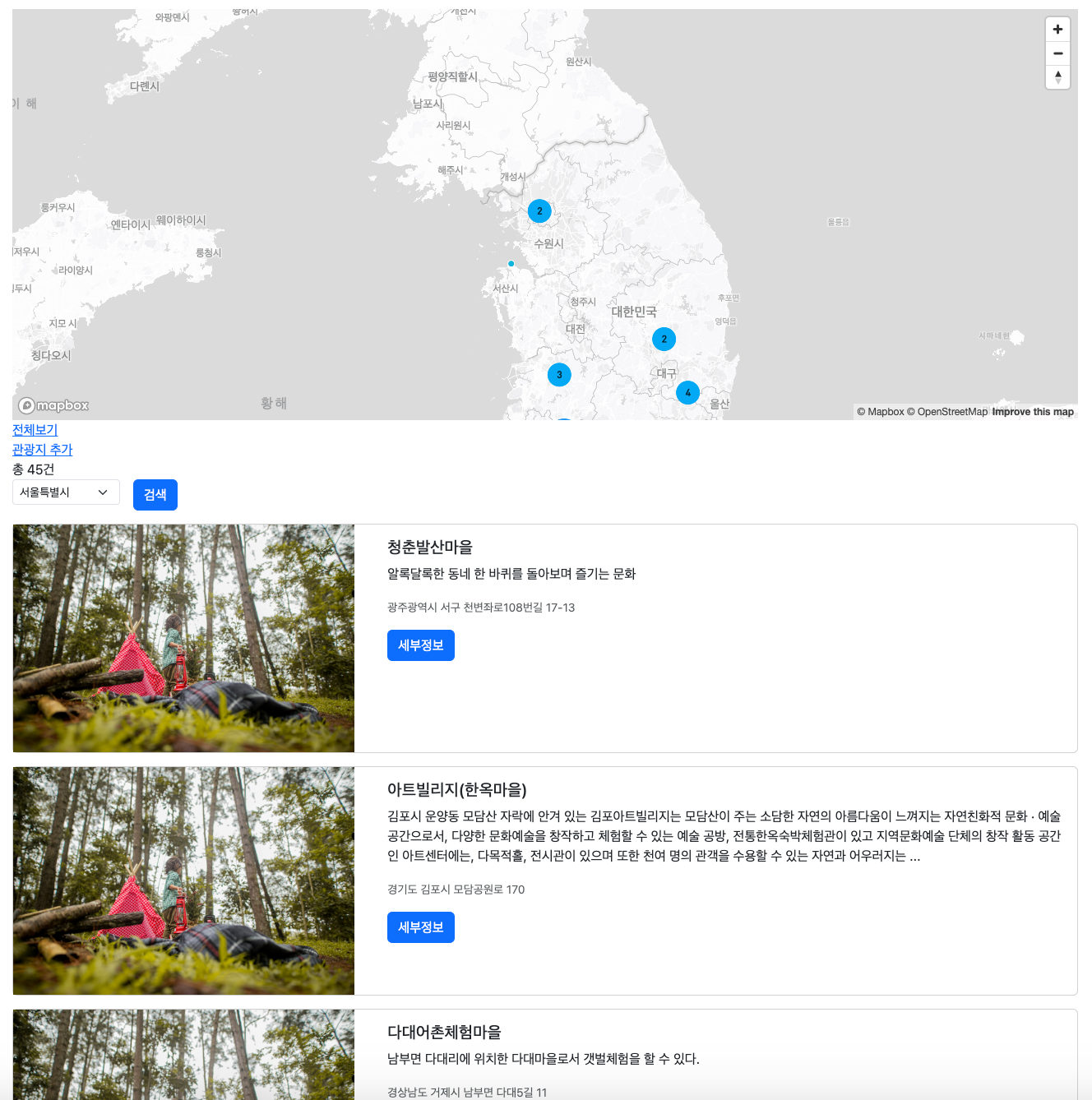 관광지명칭에 "마을" 이름이 들어 간 데이터가 총45건 조회되었고 아래와 같이 지도 위치와 목록이 표출됩니다.