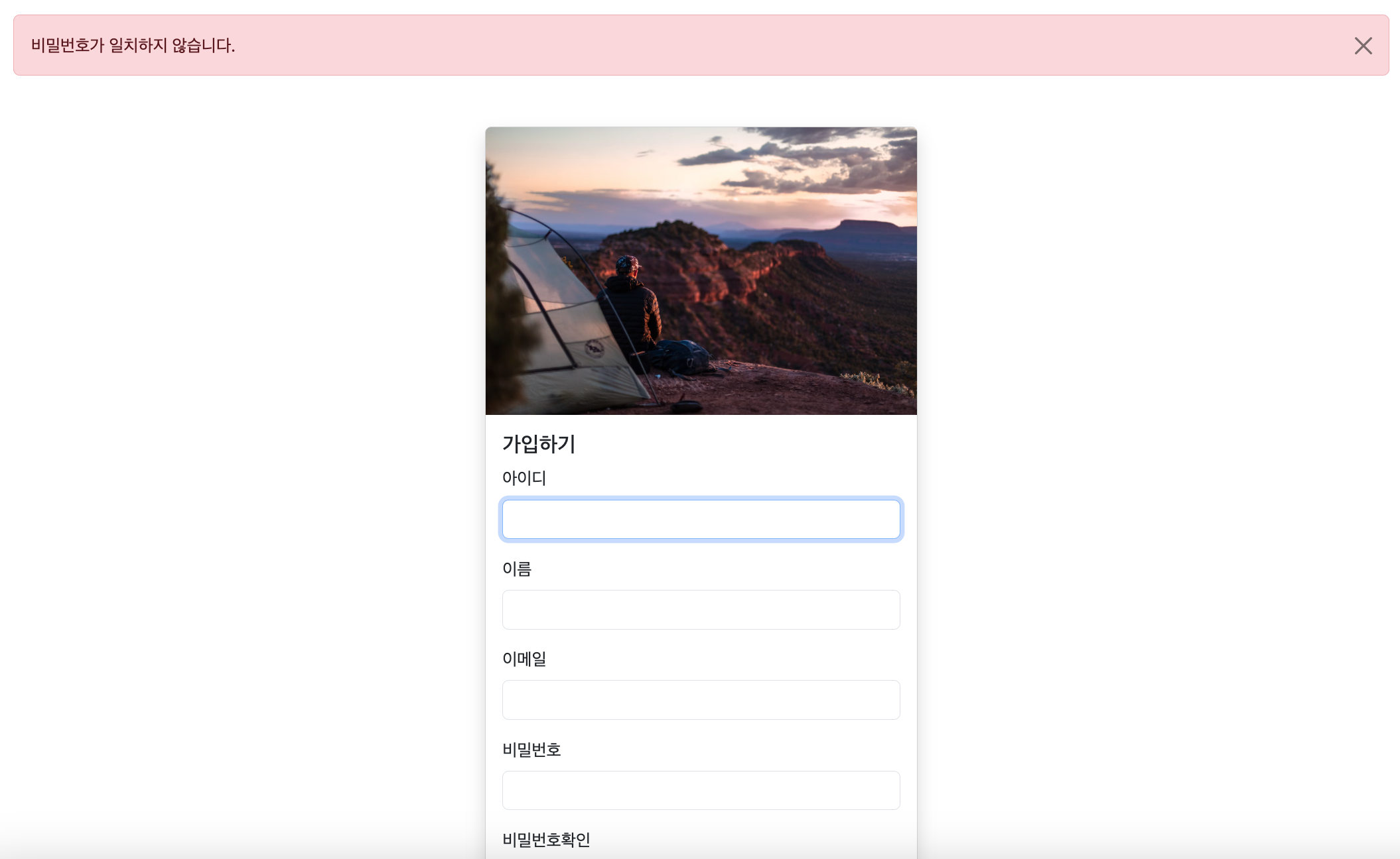 오류 메시지로 "비밀번호가 일치하지 않습니다." 전달하여 flash 를 이용하여 화면에 메시지를 표출해줍니다.