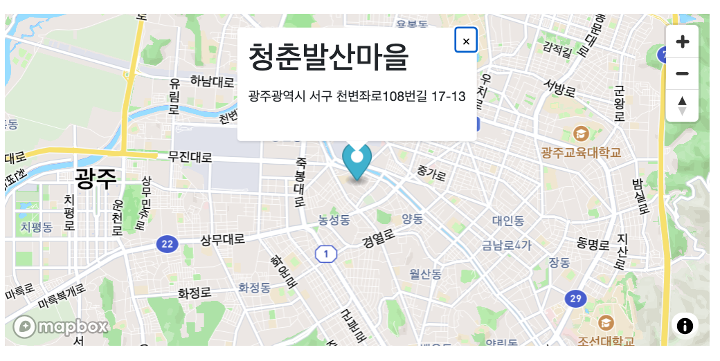 - 지도위 marker 표출은 mapboxgl.Marker() 로 지정합니다.