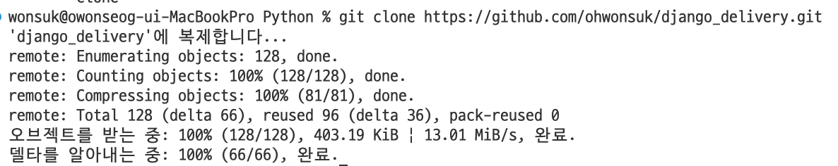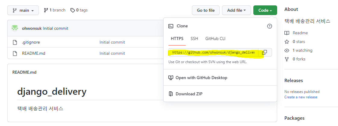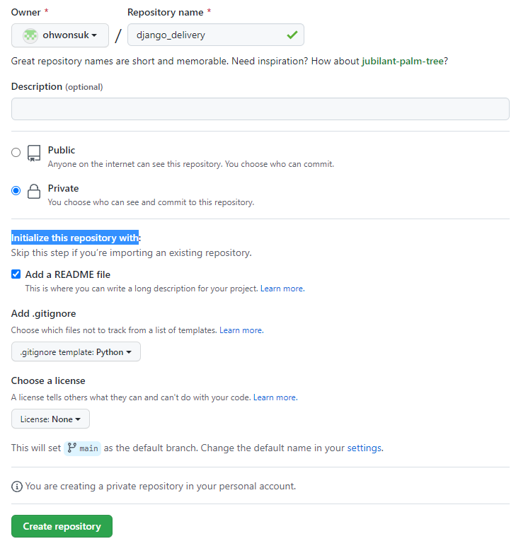 - 예시로 Dajngo_delivery Repository를 다음와 같이 생성합니다.