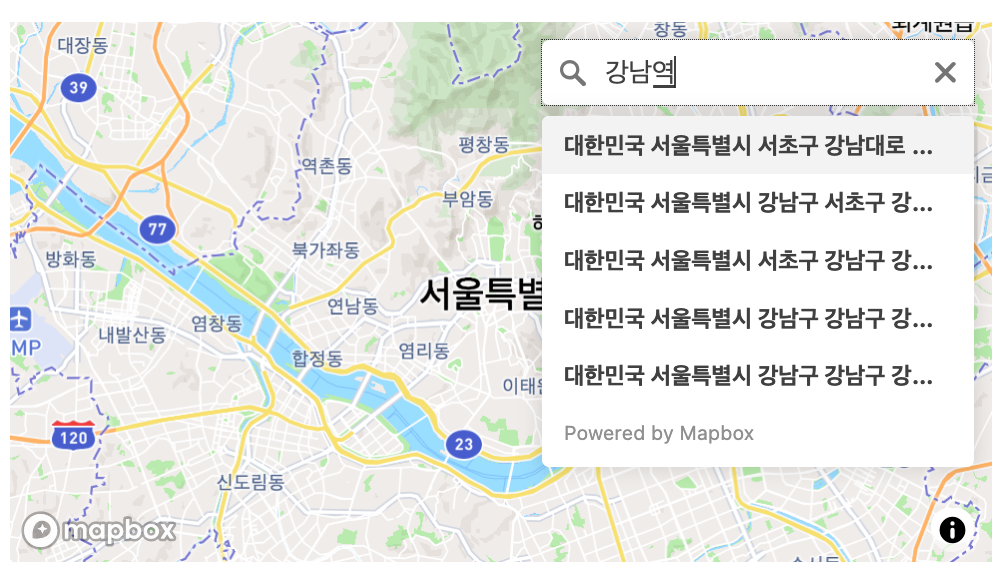 geocoding 으로 주소지 또는 POI 정보로 지도 경위도 좌표값을 얻을 수 있는데 Mapbox에서 모든 정보를 가지고 있지 않기 때문에 정확한 위치로 매칭되지 않을 수 있습니다.