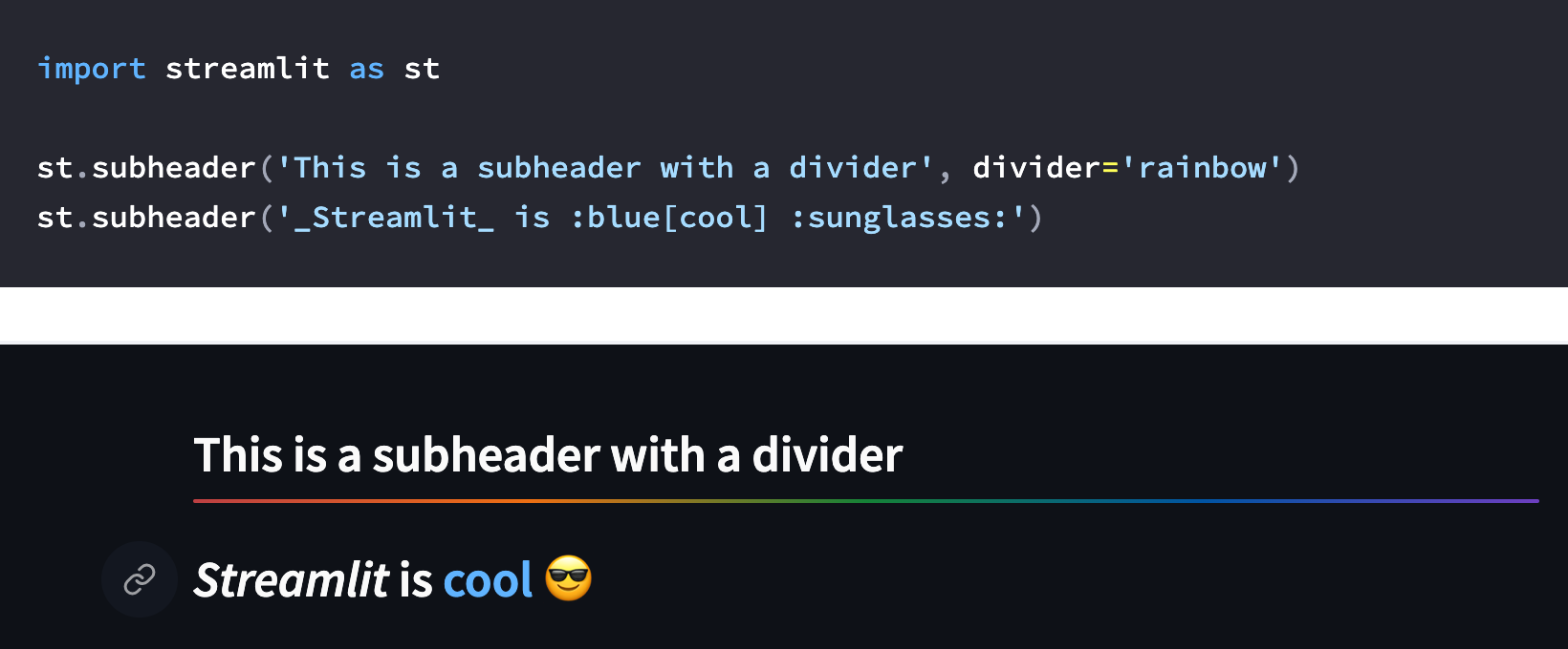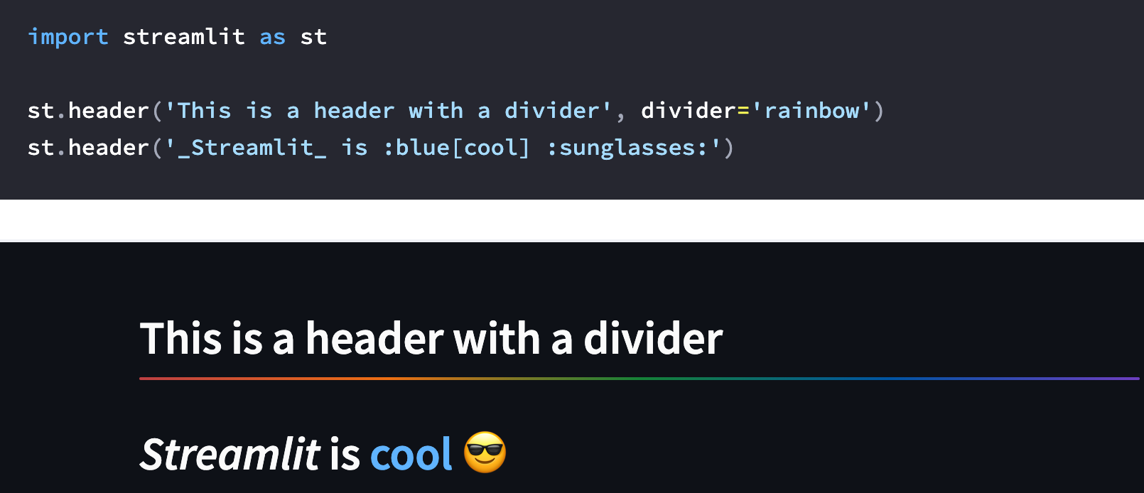- st.header - 큰 문단 구분에 활용, divider 옵션 적용시 구분선 표출