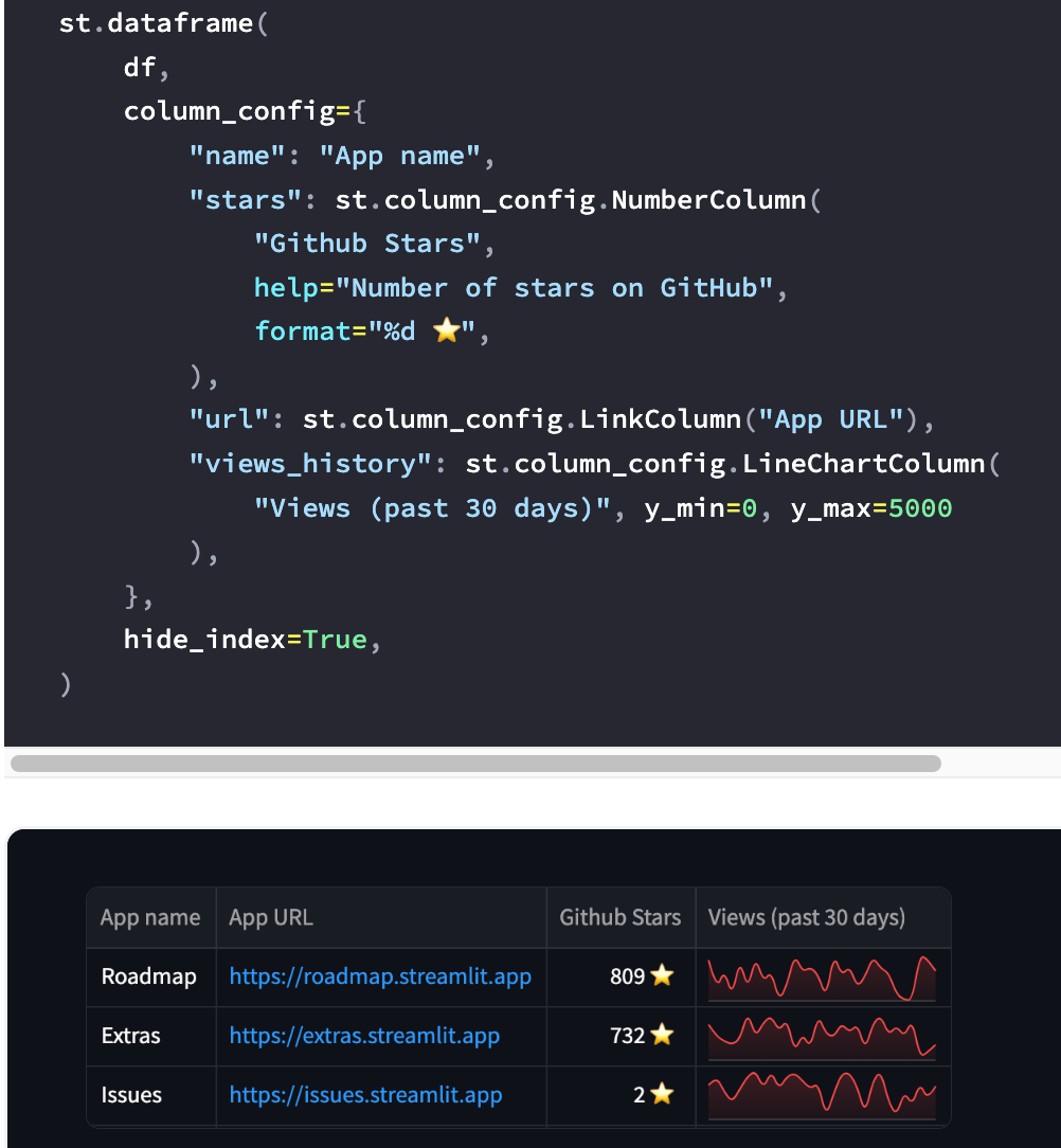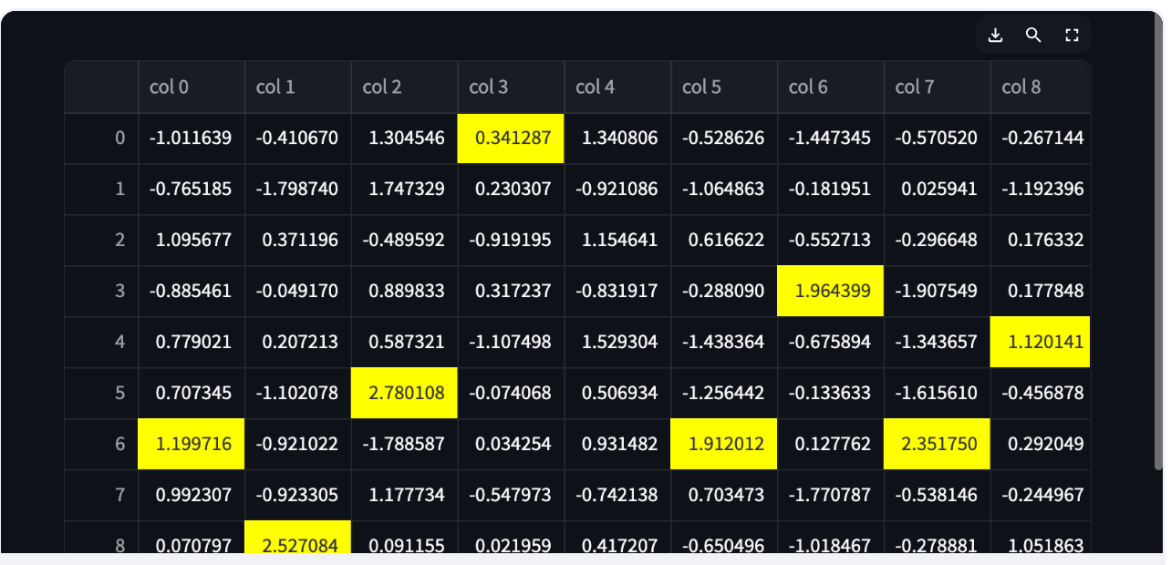 - st.dataframe - 가장 활용도 높은 라이브러리중 하나로 옵션에 따라 다양하게 표출 가능