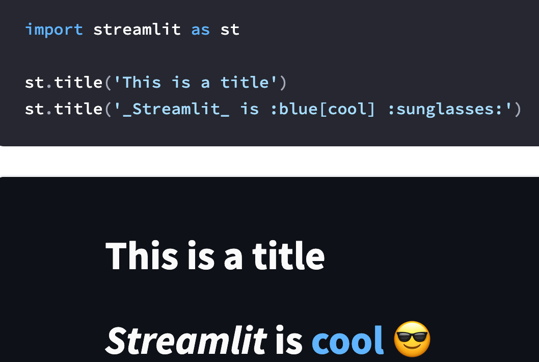- st.title - 페이지에서 1번만 사용 가능, 페이지 타이틀로 가장 글자 크기가 큼