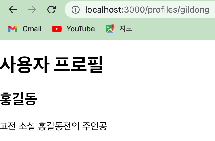 URL 파라미터는 /profiles/:username 과 같이 경로에 ":" 를 사용하여 설정합니다. 만약 URL 파라미터가 여러 개인 경우