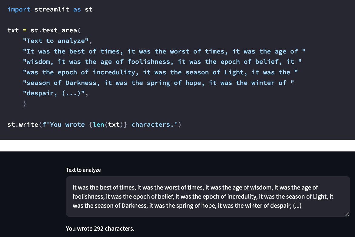 st.text_area(label, value="", height=None, max_chars=None, key=None, help=None, on_change=None, args=None, kwargs=None, *, placeholder=None, disabled=False, label_visibility="visible")