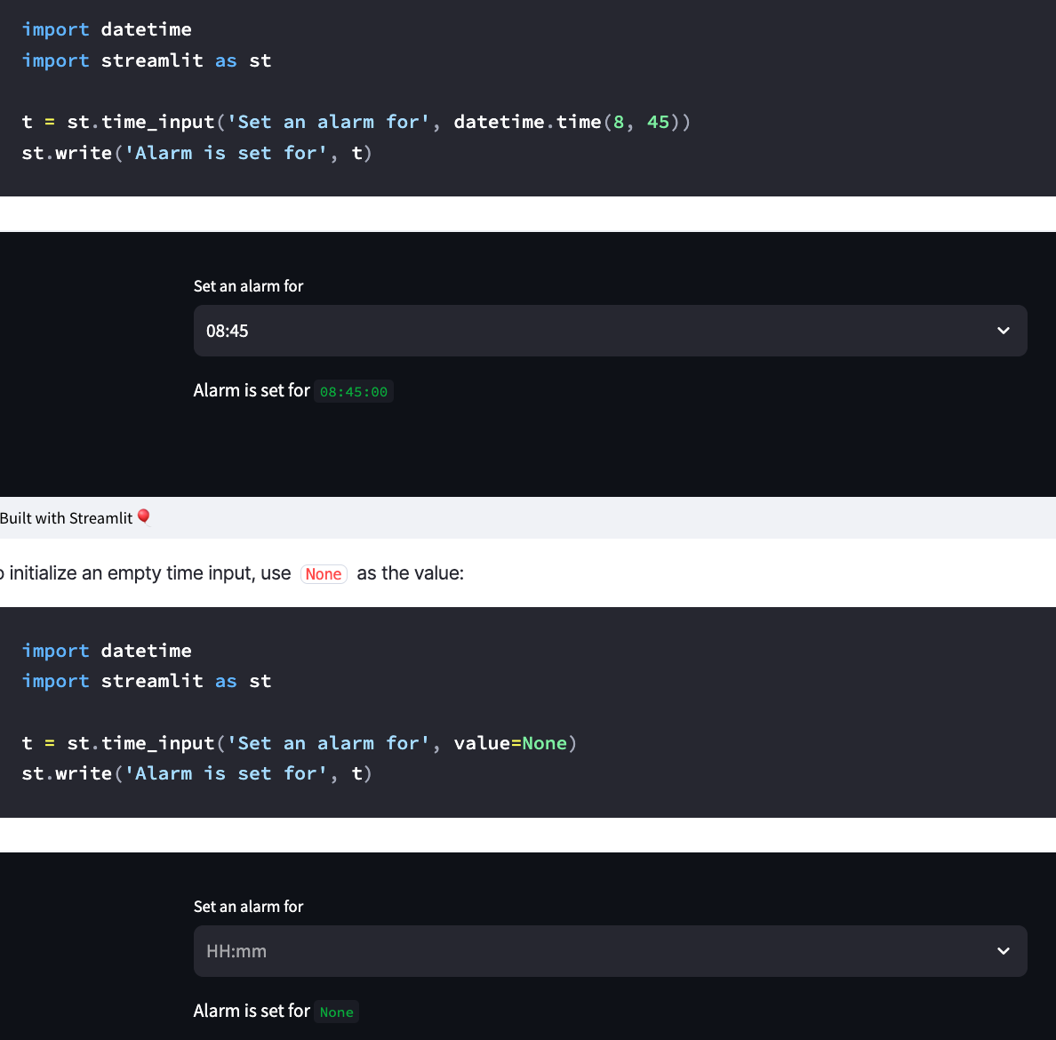 value : 초기값으로 지정한 시간. datetime.time 또는 datetime.datetime 으로 시간 입력, now 입력시 현재 시간 표출