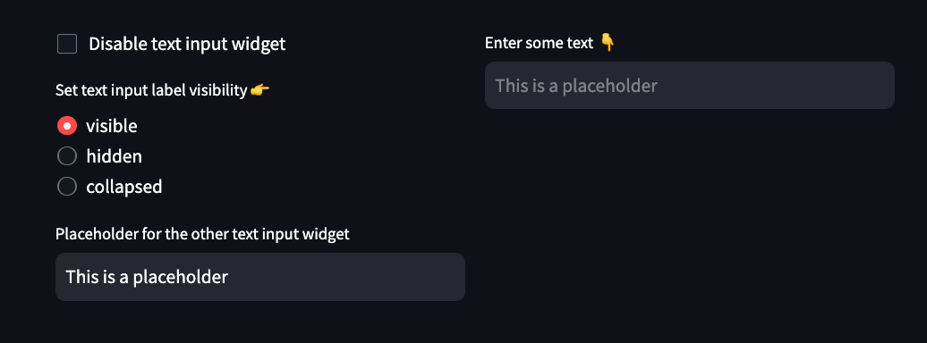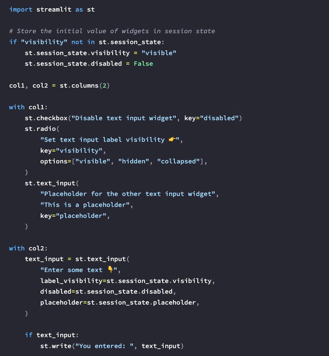 st.text_input(label, value="", max_chars=None, key=None, type="default", help=None, autocomplete=None, on_change=None, args=None, kwargs=None, *, placeholder=None, disabled=False, label_visibility="visible")