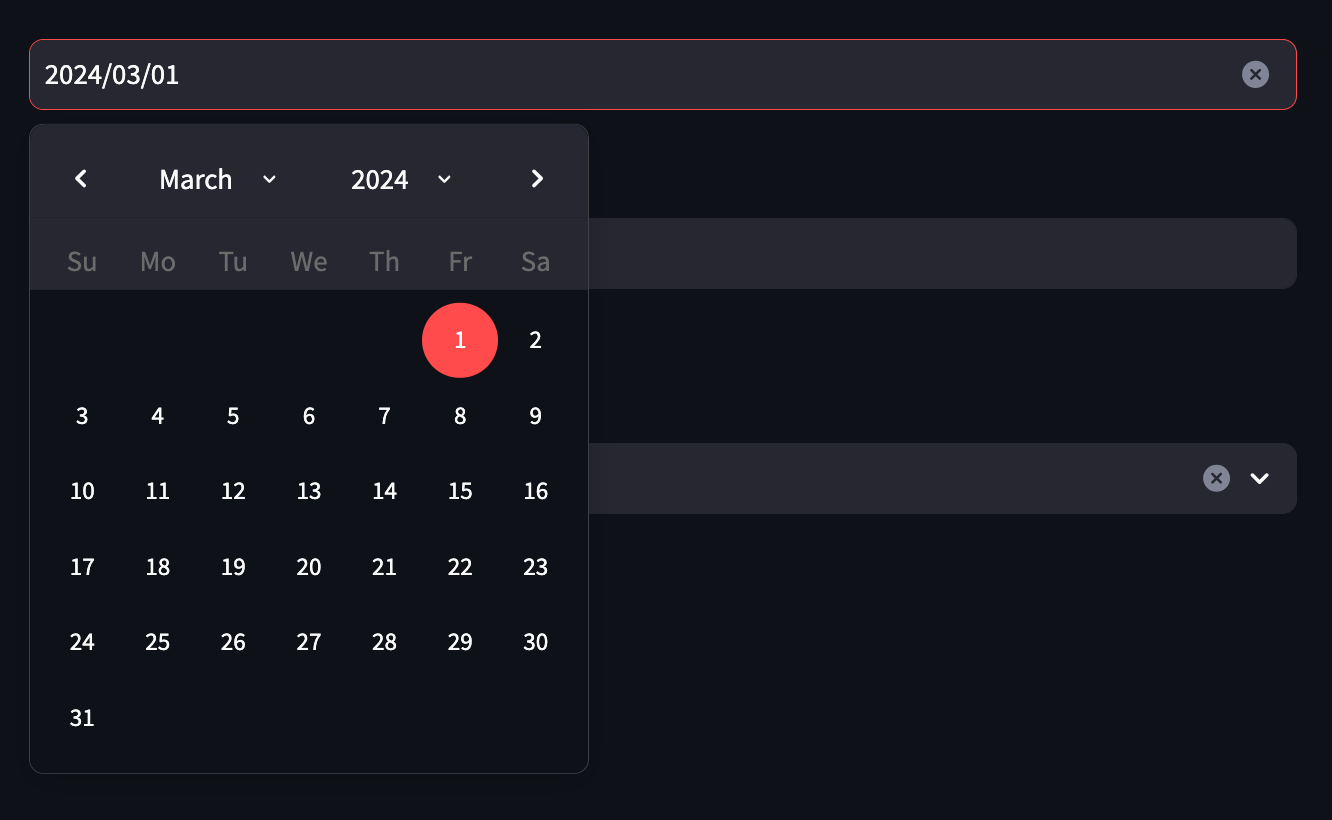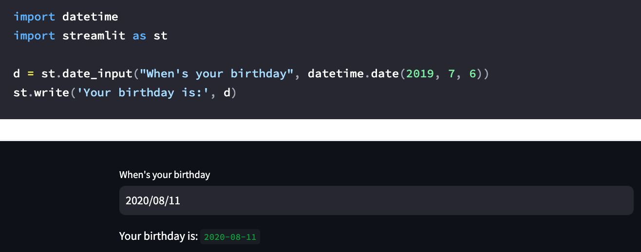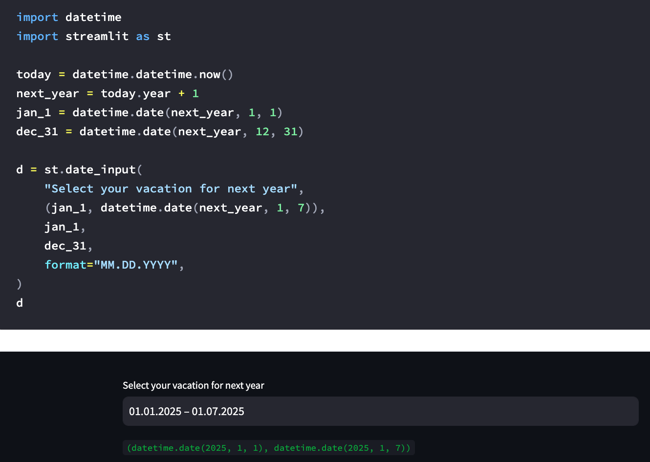st.date_input(label, value="default_value_today", min_value=None, max_value=None, key=None, help=None, on_change=None, args=None, kwargs=None, *, format="YYYY/MM/DD", disabled=False, label_visibility="visible")