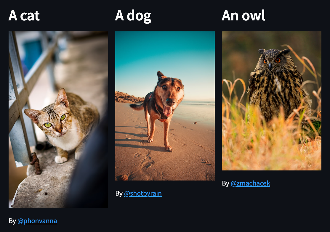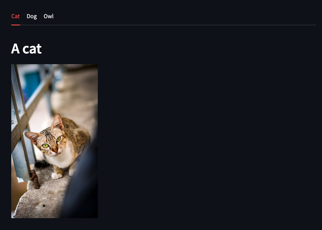 tab1, tab2, tab3 = st.tabs(["Cat", "Dog", "Owl"])