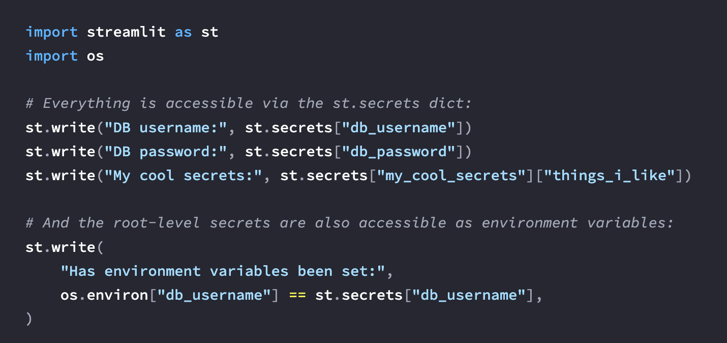 - 앱내에서 st.secrets 사용하여 secrets 해당 값을 불러오기
