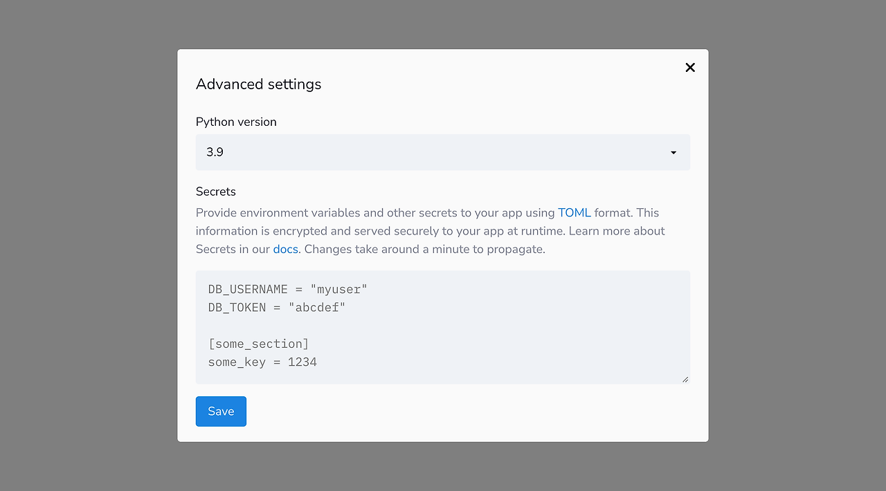 - 환경변수와 비밀 설정값을 TOML 포맷으로 입력칸에 작성