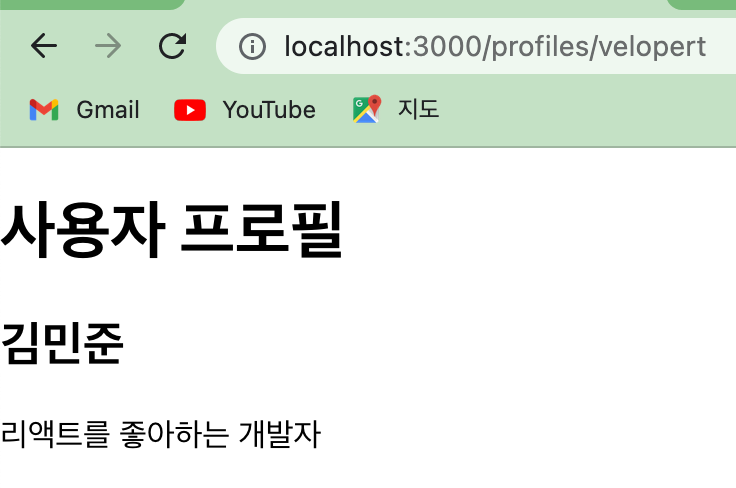 URL 파라미터는 /profiles/:username 과 같이 경로에 ":" 를 사용하여 설정합니다. 만약 URL 파라미터가 여러 개인 경우