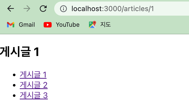 그리고 Articles 컴포넌트에 리액트 라우트에서 제공하는 Outlet 컴포넌트를 사용하면 Route의 children 으로 들어가는 JSX 엘리먼트를 보여주는 역할을 합니다. 이번 예제에서는 <Route path=":id" element={Article />} /> 가 보여집니다.