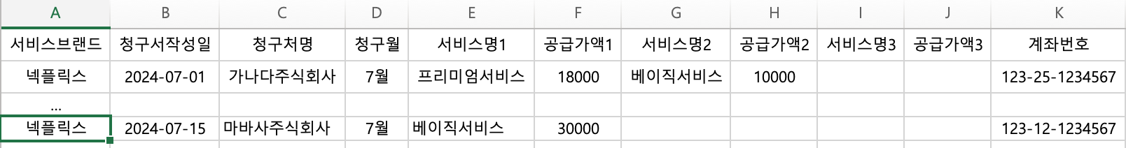- 서비스명1, 서비스명2, 서비스명3, 공급가액