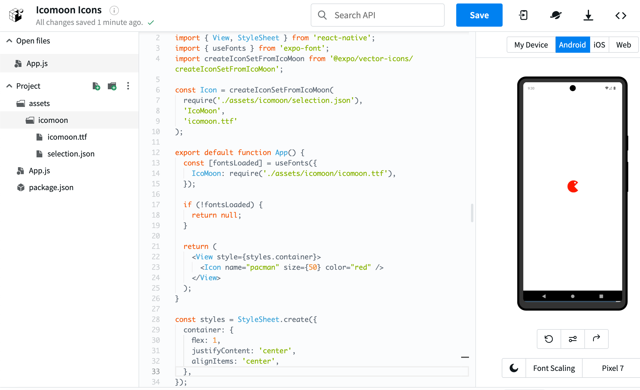 - 프로젝트내 assets 폴더에 selection.json 과 .ttf 파일이 필요