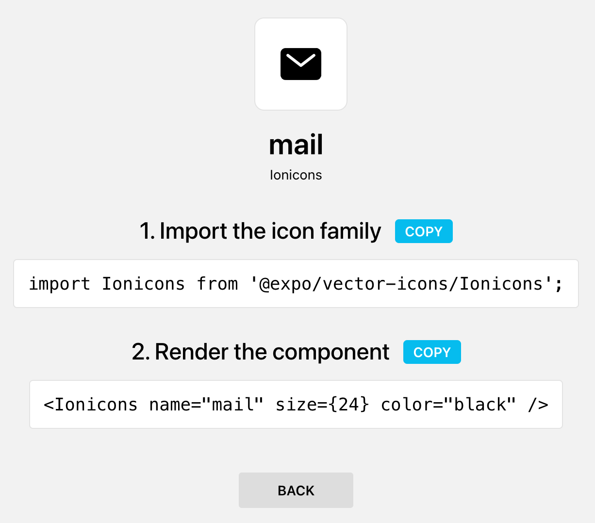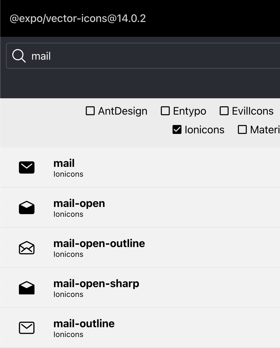 - 예시로 가장 많이 이용하는 Ionicons 를 선택하여 조회